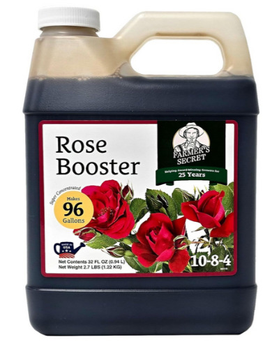 Farmer’s Secret Rose Booster is a concentrated liquid formula packaged in a 32-ounce bottle. Like Great Big Roses, it’s designed to be mixed with water, making one bottle stretch across many applications. This product specifically targets rose health and blooming throughout the entire growing season.
